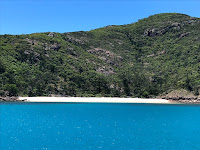 On Wednesday morning we decided on a walk - up the very steep hill and down the other side, along the foreshore and back to the boat - it was only a few kilometres but boy, was it steep! We were quite envious of the golf buggies whizzing past us as we huffed and puffed upwards. After a reviving breakfast we took our “Granny trolley” and walked to the IGA for a few last minute supplies, then we filled the boat with water, untied the lines and bade farewell to Hammo, cruising down Dent Passage and across towards Lindeman and Shaw Islands, stopping in the beautiful Billbob bay, on the southern side, for lunch, then continuing on. This southern part of the Whitsundays is much less visited but no less beautiful, you could spend a month cruising the area and not reach every anchorage. Mid afternoon we passed Coppersmith Rock, with its very modern new age lighthouse, before rounding Goldsmith Island and dropping anchor in Stingray Bay. We had intended kayaking to shore and having a refreshing swim, however the wind got very gusty and we decided against that plan, choosing to relax for the afternoon. As a precaution, the Captain put out over 50m of anchor chain - enough to keep us well and truly in place! The wind continued into the evening and we watched thunderstorms pass just north of us, continuing on to the coast with an amazing lightning show before dying away to calm clear conditions after dark.